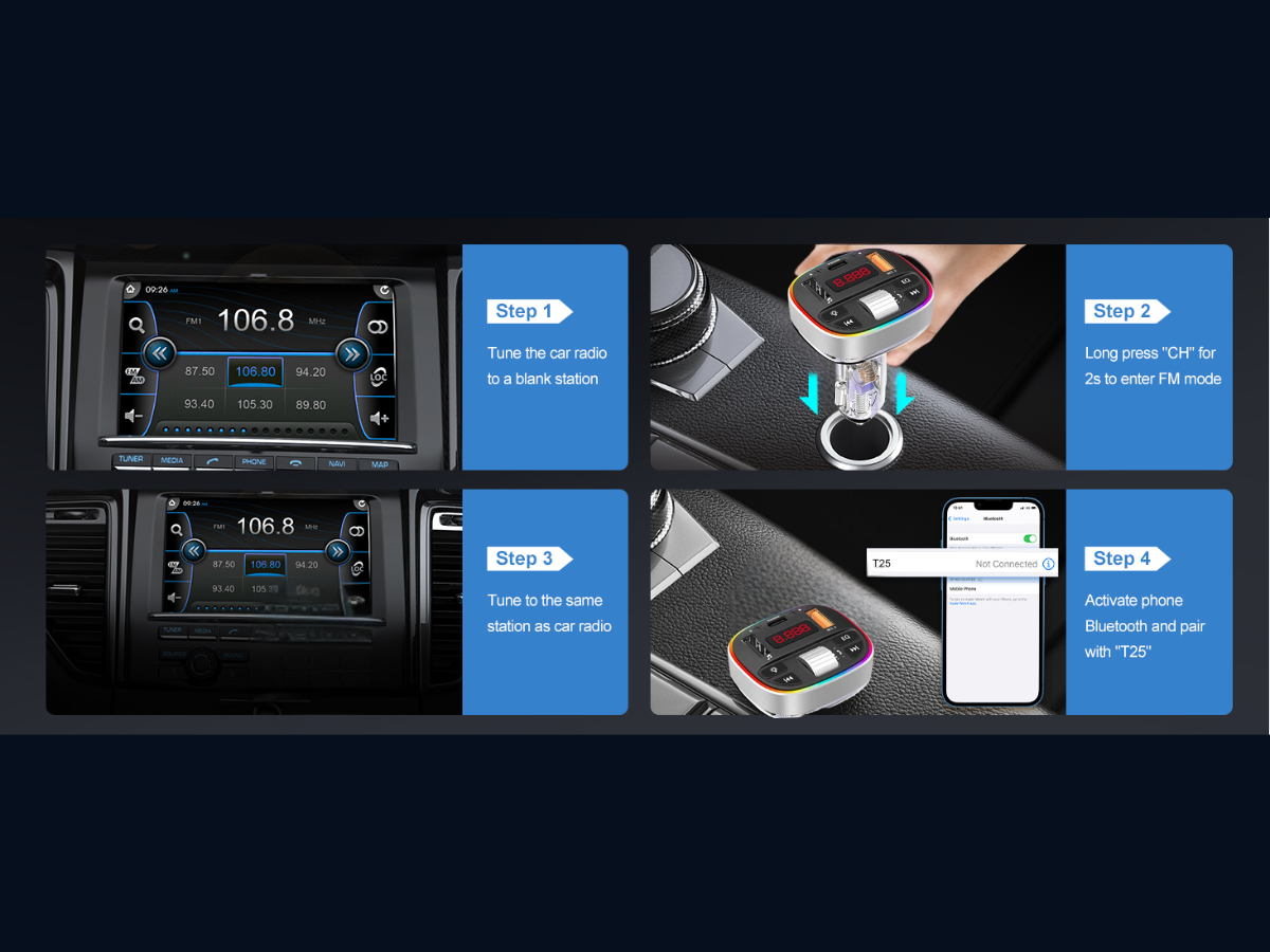 ✅ MP3 Player & FM Transmitter – Play music via Bluetooth, USB, or TF card